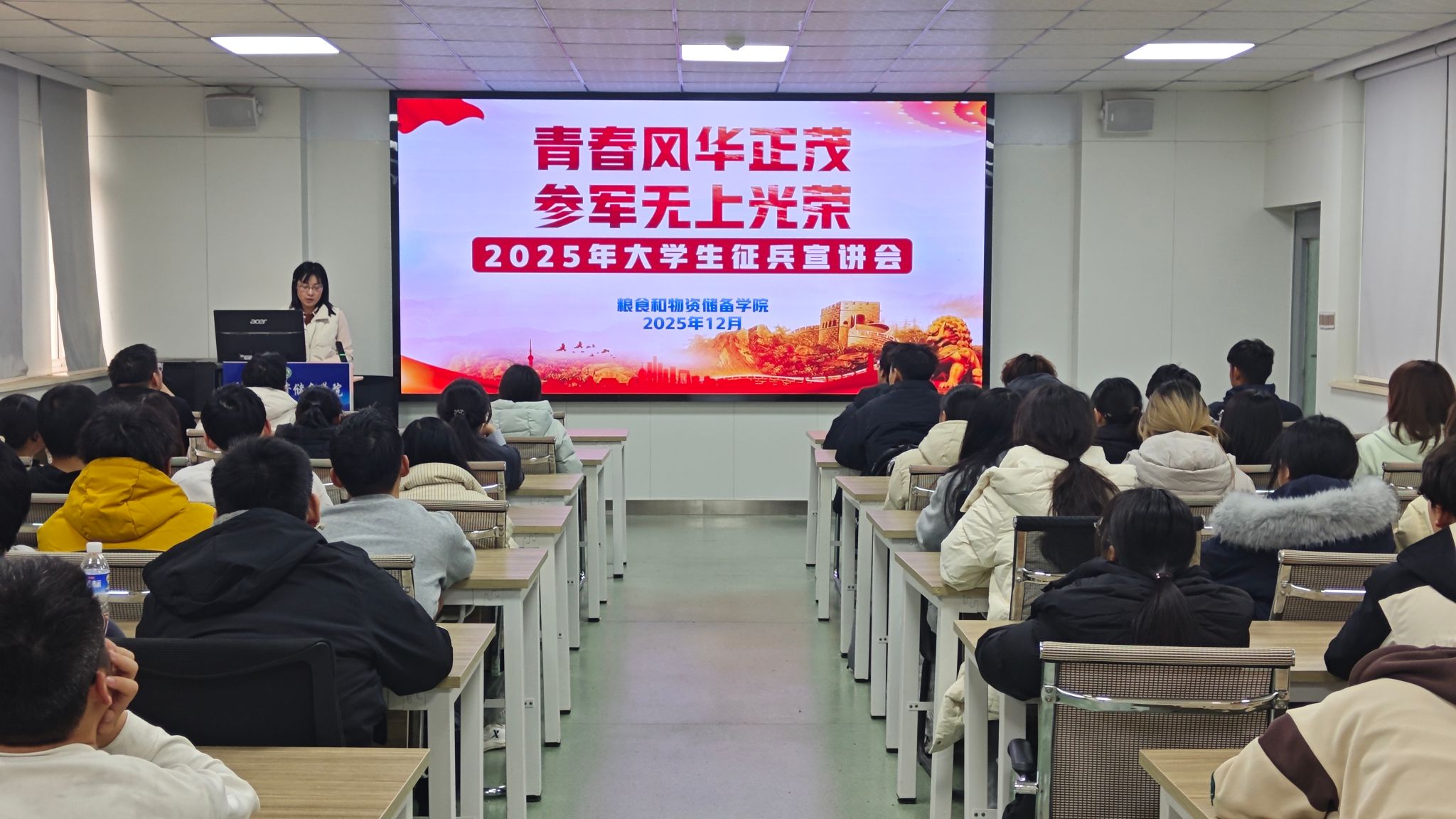为积极响应国家征兵号召,激发青年学子的爱国情怀与责任担当,粮食和物资储备学院于12月9日在崇实楼202会议室举办2025年下半年征兵政策宣讲会。学院学工办主任马春艳、团委副书记刘宇畅全体辅导员及大一新生共同参与,现场气氛热烈,反响积极。