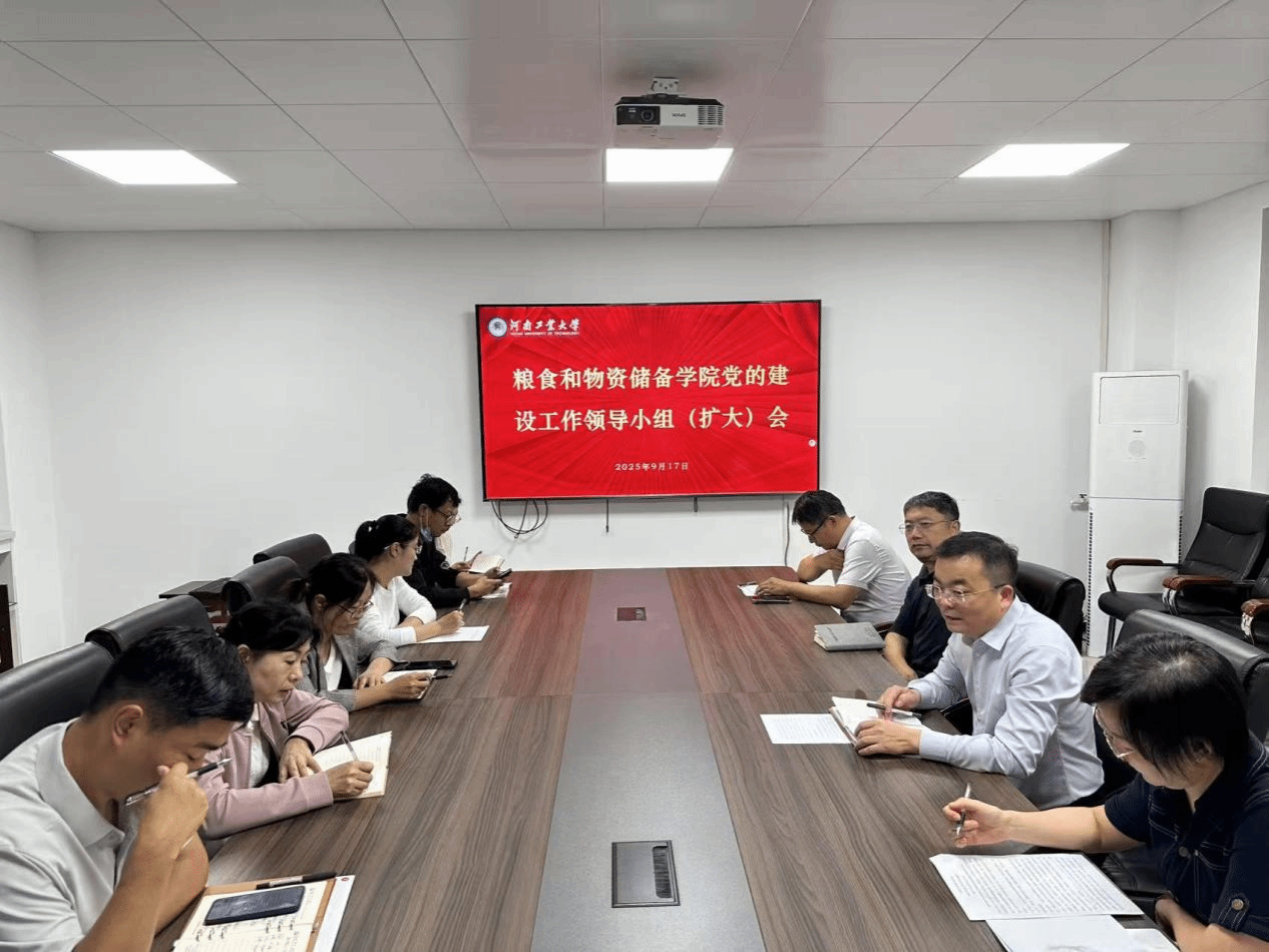 9 月 17 日上午,粮食和物资储备学院党委书记代辉亚主持召开学院党的建设工作领导小组(扩大)会议,专题传达学习习近平总书记关于深入贯彻中央八项规定精神学习教育的重要指示、中央及省委有关会议精神,全面落实学校党的建设工作领导小组(扩大)会议部署要求,总结学院前期学习教育开展成效,对巩固拓展学习教育成果、锲而不舍落实中央八项规定精神、推进学院作风建设常态化长效化进行安排部署。学院党委书记代辉亚,院党委副书记梁艳,学院领导班子全体成员、各系(中心)主任、党支部书记、办公室及学工办全体工作人员参加会议。会议由梁艳主持。