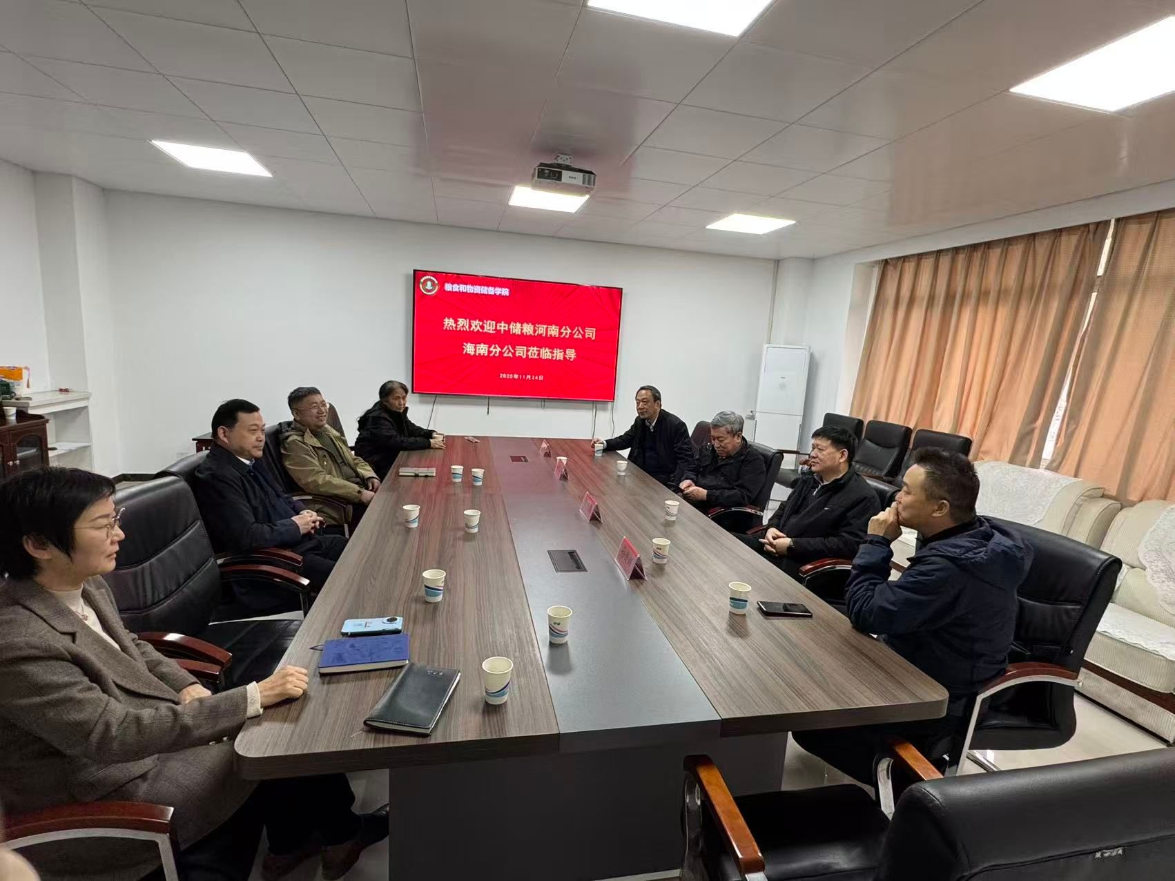为精准锚定粮食储备行业人才需求痛点,深化校企协同育人机制建设,11月24日下午,中储粮河南分公司、海南分公司联合调研组莅临粮食和物资储备学院,在崇实楼212会议室开展人才培养专项调研并举行深度座谈会。中储粮河南分公司党委副书记游海洋、海南分公司党委副书记付泽海,河南分公司党群人事处处长苏小强、海南分公司仓储购销部部长孙奇辉及相关工作人员,粮储学院党委书记代辉亚、院长吴文福、副书记梁艳及王殿轩、张玉荣等资深教授共同出席座谈,为校企合作精准“把脉”。