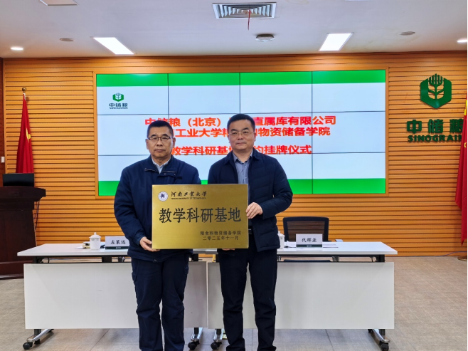 代辉亚表示,在“京师之枕”的昌平隆重举行校企教学科研实习基地的授牌活动,感到十分的激动和喜悦。介绍了学院的基本情况,认为此次教学科研基地的授牌,是双方深化合作的具体体现,希望双方围绕粮食储藏领域卡脖子关键技术联合攻关,在粮食储藏行业人才队伍培养、科技成果转化等领域开展深入合作,共同推动行业进步,保障国家粮食安全。左策远介绍了在粮食收储、安全管控、技术创新等方面现状,昌平直属库作为国家粮食战略储备的重要节点,承担着首都粮食安全保障的神圣使命。双方因“粮”结缘、因“安”相聚,必将书写产教融合、协同发展的崭新篇章。