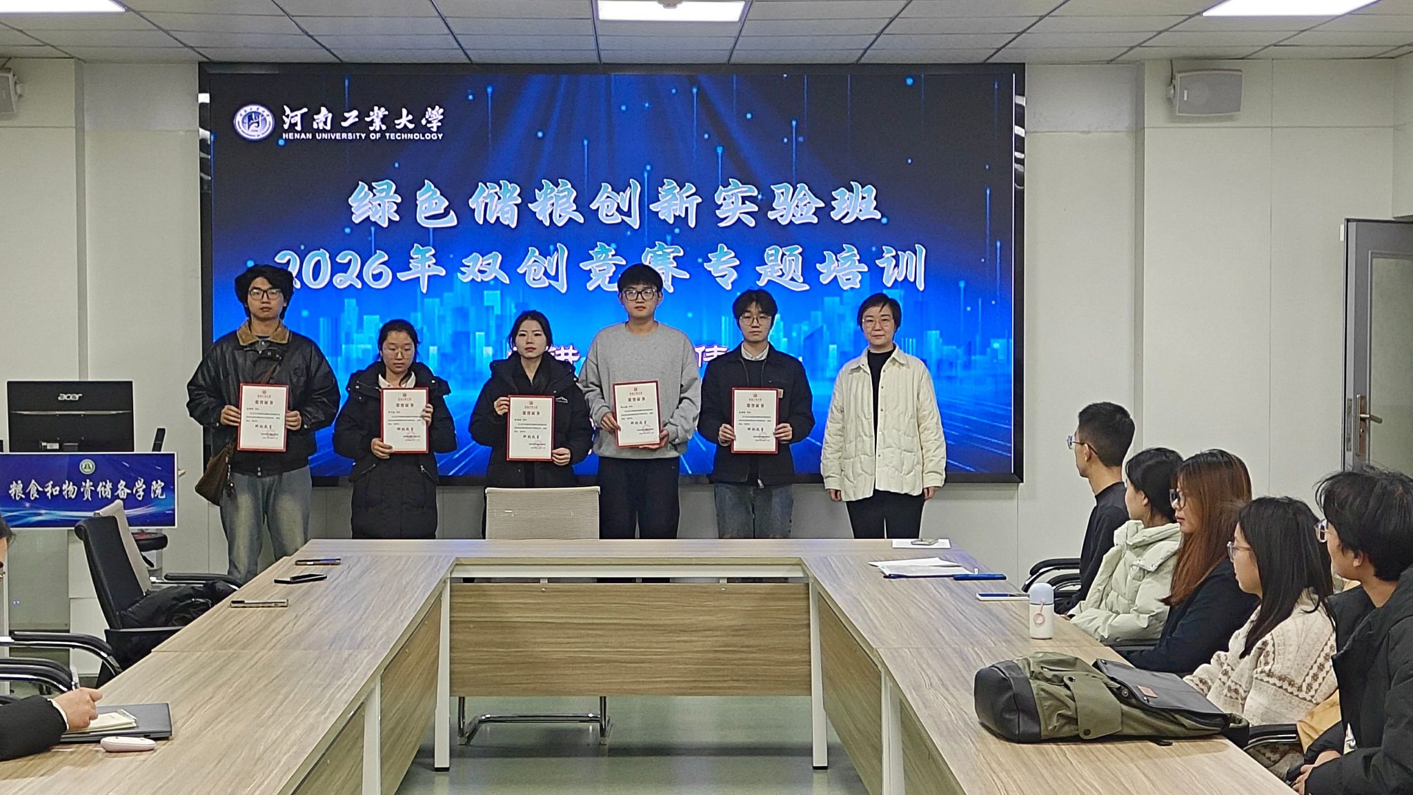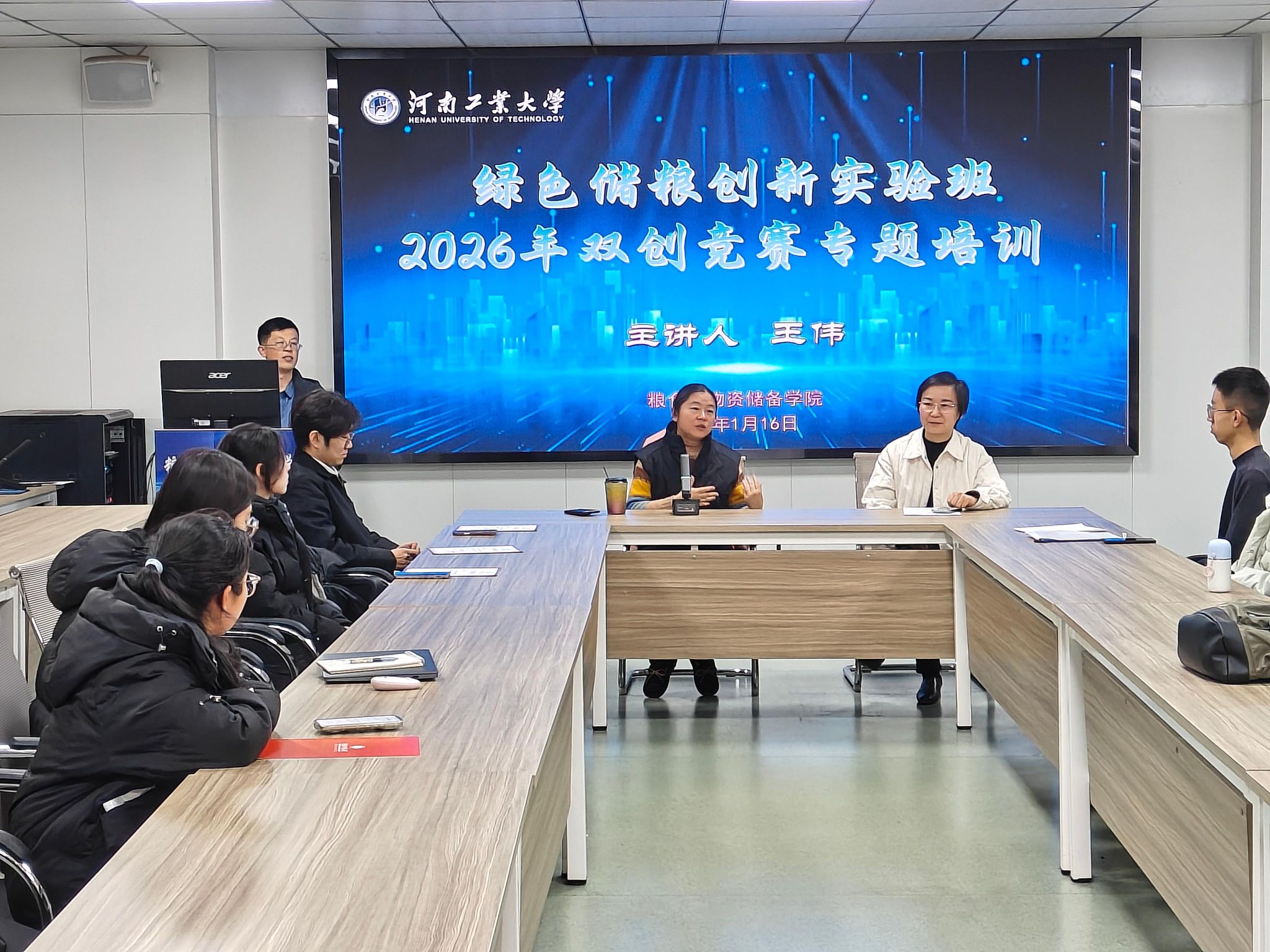为深化绿色储粮领域创新人才培养,赋能学子备战双创赛事,1月16日下午,粮食和物资储备学院于崇实楼202捷赛厅举办2026年度绿色储粮创新实验班开班仪式暨双创赛事专题培训会。中国青年创业导师、管理学院王伟老师,院党委副书记梁艳及实验班全体学员参会,会议由学院团委副书记刘宇畅主持。