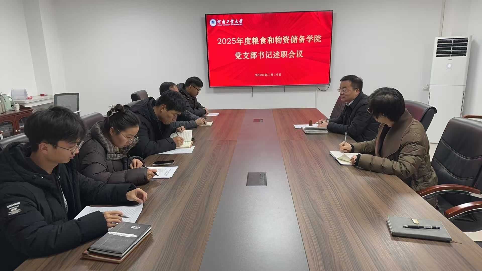 为全面检验各党支部2025年度党建工作成效,压实基层党建工作责任,1月19日,粮食和物资储备学院召开2025年度支部书记述职评议会议。学院党委书记代辉亚主持会议并讲话,学院党委副书记梁艳及各党支部书记参加会议。